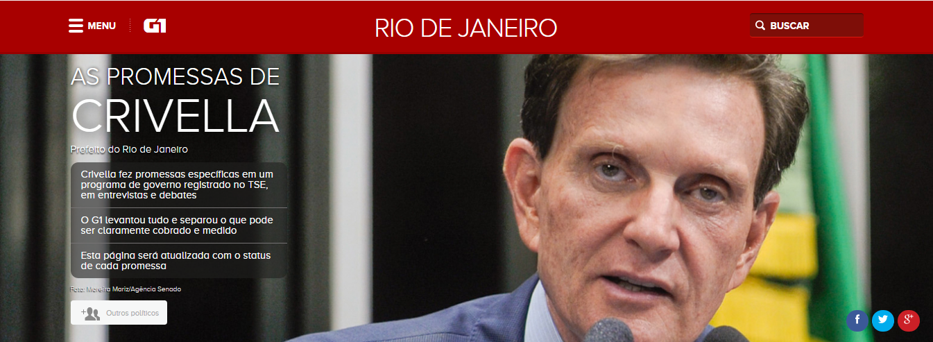 G1 newspaper hosts a page titled “Crivella’s Promises,” which highlights promises made by Crivella during interviews and debates “that can be clearly measured,” and updates the progress on each of these promises. The portal also contains pages to monitor the promises made by acting president Michel Temer, and of 27 governors and mayors of 26 states and capitols.