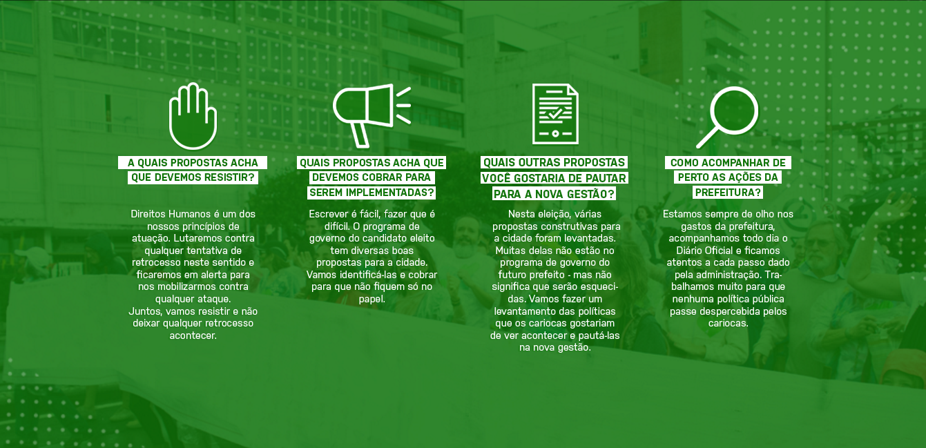 #EmCimaDoCrivella (#OnTopofCrivella) is one such action, a campaign that promises to “ensure promises will be fulfilled, resist setbacks, supervise management and challenge the administration every day.” It invites everyone to join the movement to stay “#OnTopofCrivella.” For this, they track the Official Gazette daily, keep an eye on City Hall expenses, advocate for laws that Rio residents would like see enacted, and mobilize their network to pressure against proposals that violate citizens’ rights. Some of their actions up until this moment include lobbying on behalf of special education support agents and against the appointment of Crivella’s son as the Casa Civil secretary. To subscribe to the site and become part of an organized network that receives alerts, click here.