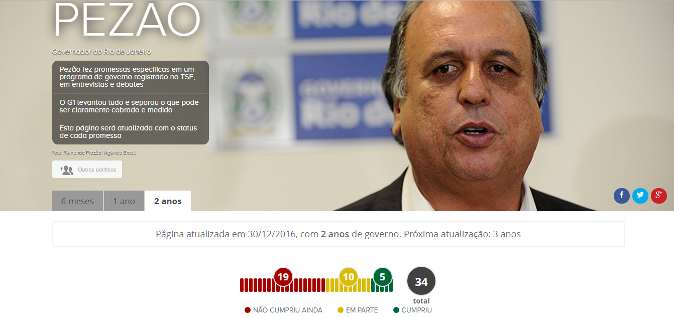 On the site, the top of the page reads “Page updated on 01/01/2017, Inauguration Day. Next update: 2017.” Following this there is a thematic map of 30 promises that Crivella made during the campaign, out of the 41 that were officially registered by the Regional Electoral Tribunal. However, if you go to the G1 page of Rio’s governor, Pezão, who is currently involved in legal corruption proceedings, the monitoring system is demonstrated by the image below and is scheduled for annual updates, which is a time scale that is not sensitive to those who wish to pressure the city to keep its promises.