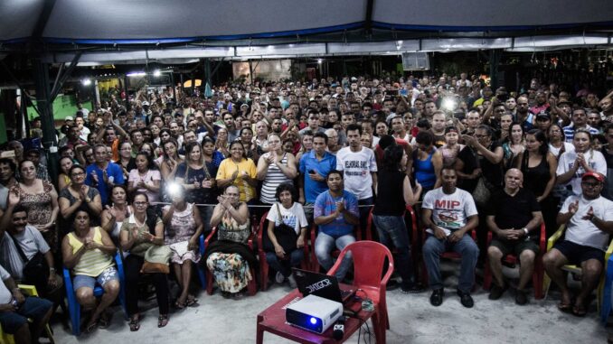 Hundreds of people gathered at the Campo do Via Light in the Rio das Pedras favela, in the West Zone of Rio de Janeiro on Thursday, October 26, to hear an important announcement from the city government regarding the verticalization project proposed in the Strategic Plan of Mayor Marcelo Crivella. After multiple speakers, it was the turn of city councilman and Crivella representative, Paulo Santos Messina, to address the crowd, which had been waiting all evening to hear what he had to say: “Yesterday, a decision about the project was reached… All the resources that were allocated to constructing those buildings, those plazas, will be used to install basic sanitation, to pave roads, to facilitate river water collection, to build channels for the river. Infrastructure for the community as it is now. There will be no evictions.” The crowd erupted in applause and cheers. Messina later went further, stating that there would be no evictions anywhere in Rio under the Crivella administration.