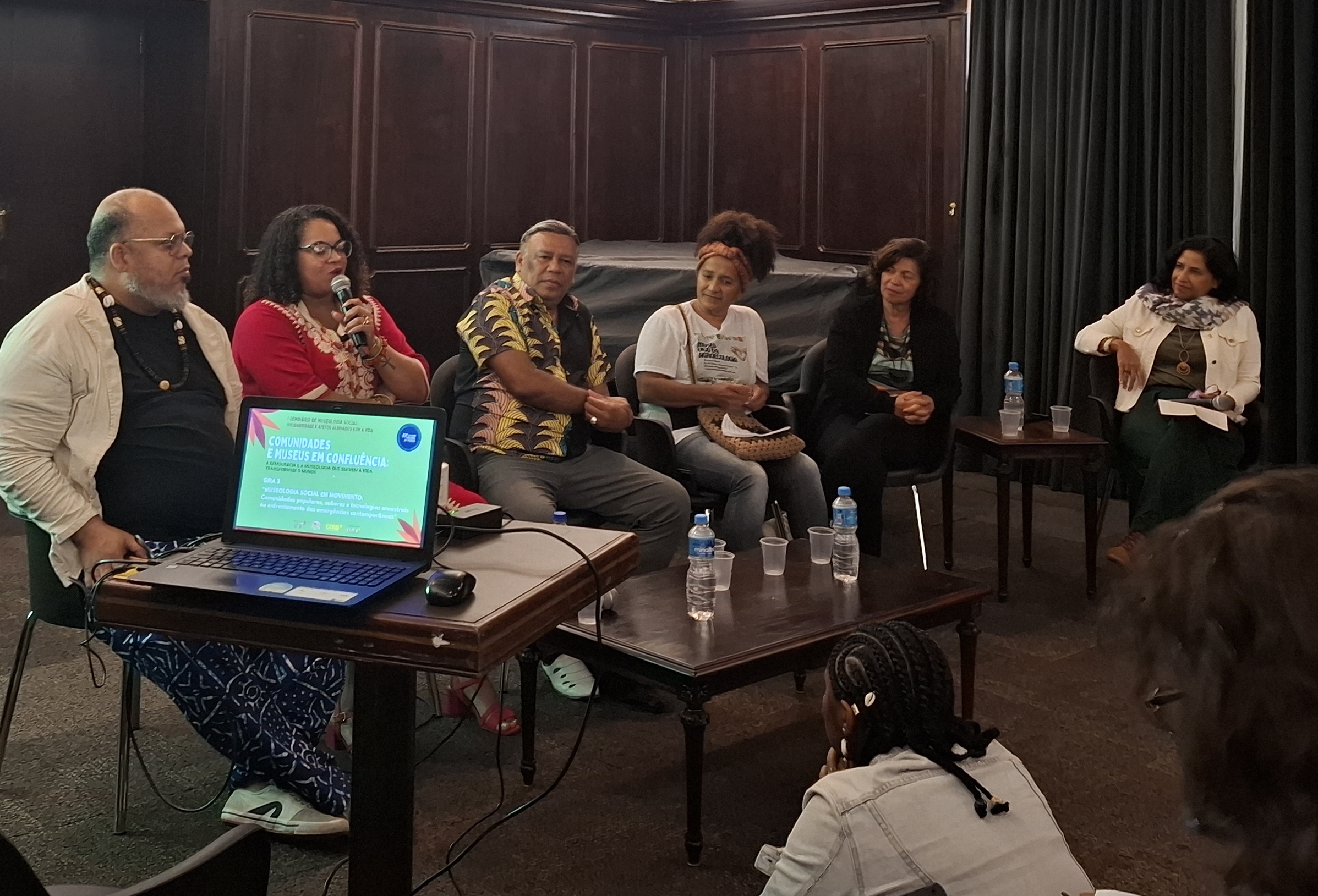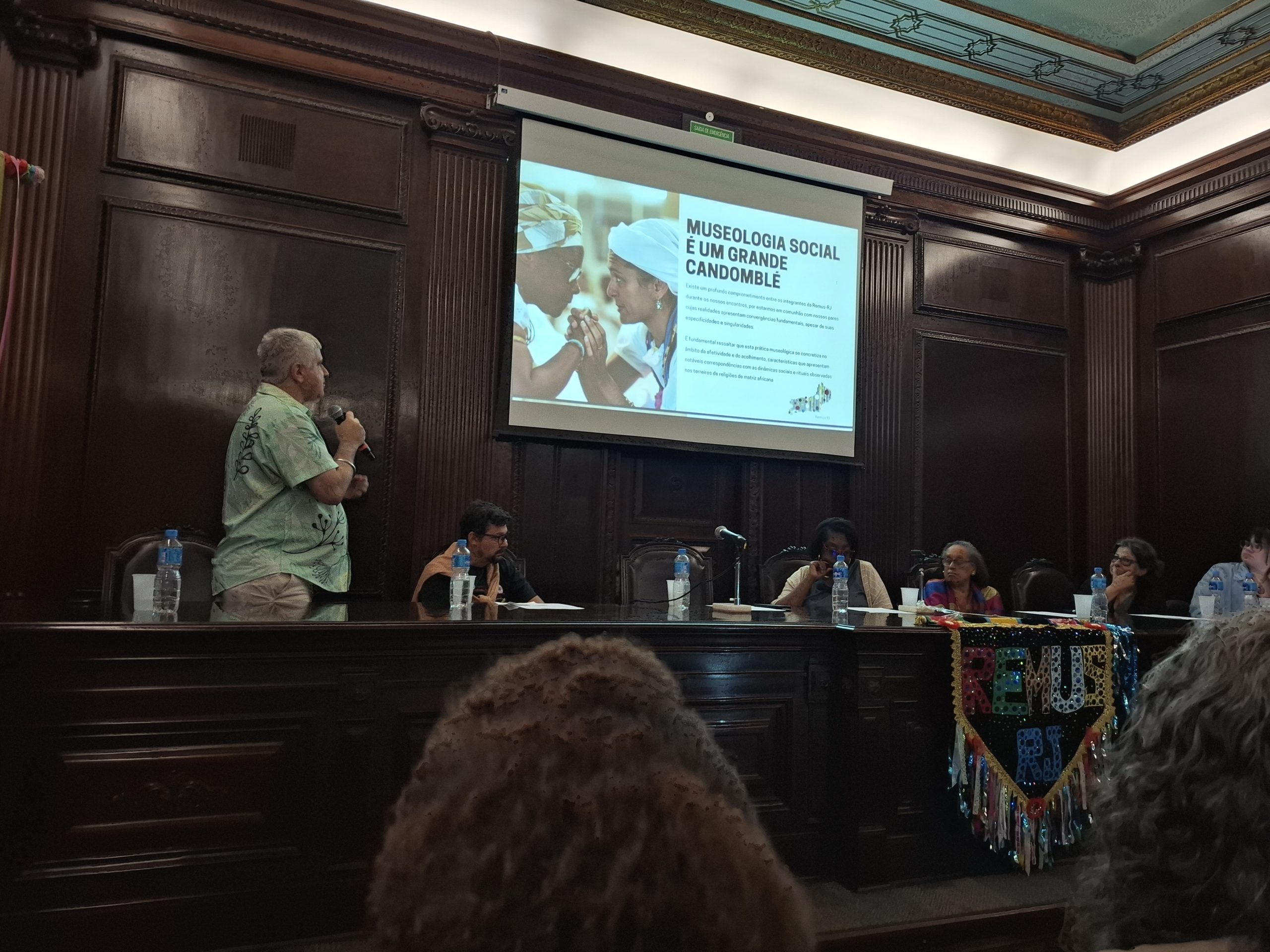 The second panel, “Social Museology in Movement: Grassroots Communities, Knowledge, and Ancestral Technologies in Confronting Contemporary Emergencies,” featured: Alexandre de Nadal Arantes, communications director at the Pretos Novos Institute, in Gamboa; Magali Cunha, professor and journalist; Candomblé Priestess Flávia da Silva Pinto, religious minister of Umbanda and Candomblé Ketu and founder of the Olga do Alaketu Living Museum in Greater Rio’s Seropédica; Jandira Rocha de Oliveira, coordinator of the Agroecology Living Museum; and Candomblé Priest Paulo José dos Reis, from the Bongaba Quilombo. The last two panelists are from Magé, in the Baixada Fluminense.