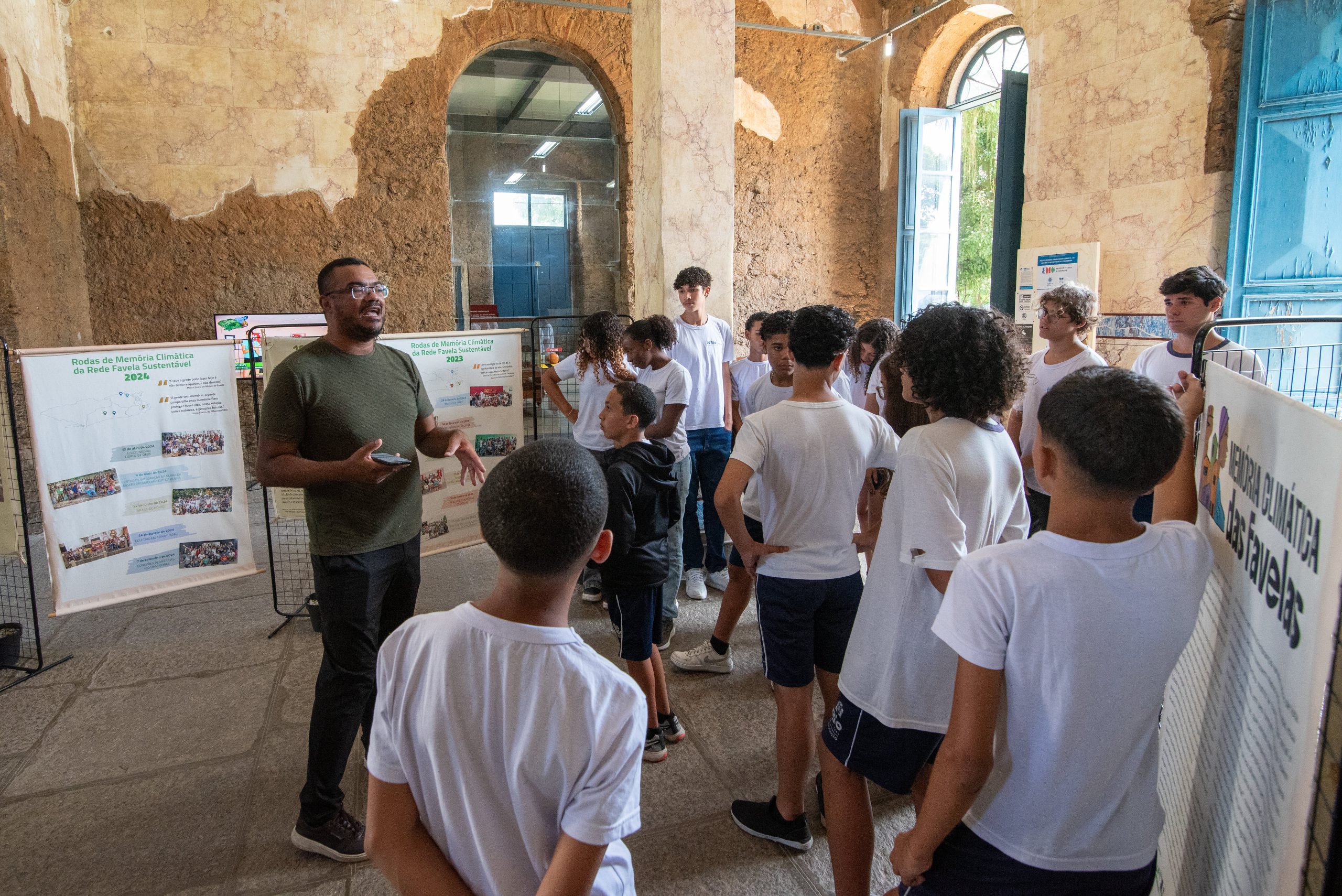 Bruno Almeida leads a guided tour of the Favela Climate Memory exhibition in Santa Cruz with students from the Princesa Isabel Municipal School. Photo: Bárbara Dias
