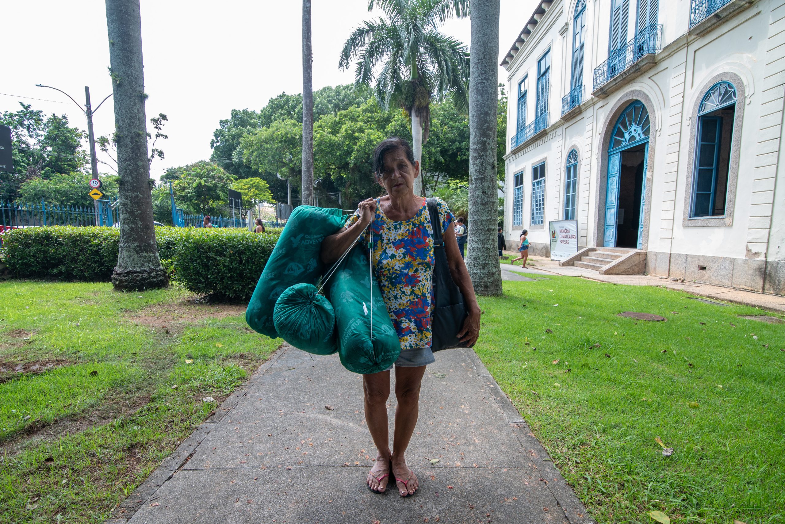 Marlene Ayres carries three sleeping mats that she received at the Palacete Princesa Isabel, in Santa Cruz. Amid visits by students from the Princesa Isabel Municipal School to the Favela Climate Memory exhibition, people affected by recent floods were receiving support from the Municipal Secretariat of Social Assistance. Photo: Bárbara Dias